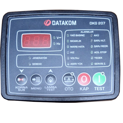 Datakom DKG-207, şebeke elektriği kesildiğinde jeneratörü otomatik olarak çalıştıran, durduran ve yük transferini (şebeke-jeneratör arası) yöneten mikroişlemci kontrollü bir otomatik jeneratör kontrol cihazıdır