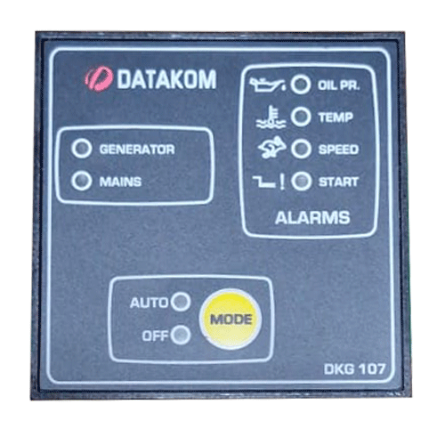 Datakom DKG-107, jeneratörlerin otomatik çalışması, durması ve şebeke elektriği kesildiğinde yük transferini (jeneratör-şebeke arası geçiş) yöneten, mikroişlemci kontrollü, ekonomik ve kompakt bir jeneratör kontrol cihazıdır.